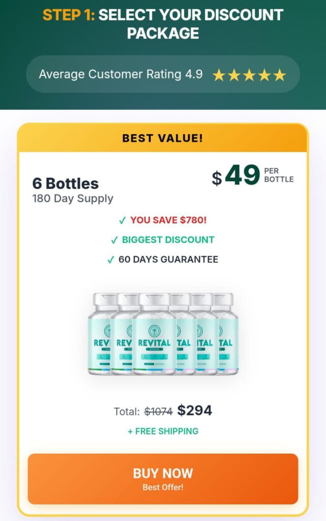 Currently, Revital is backed by a 60-day money-back guarantee, giving you ample time to try it risk-free. Free shipping is also available on select multi-bottle packages, along with exclusive discounts for new customers.
